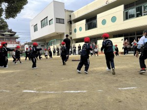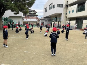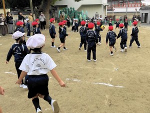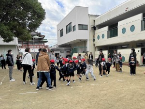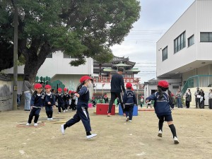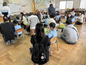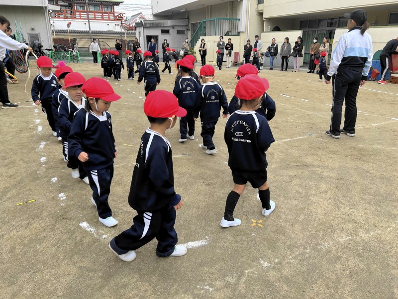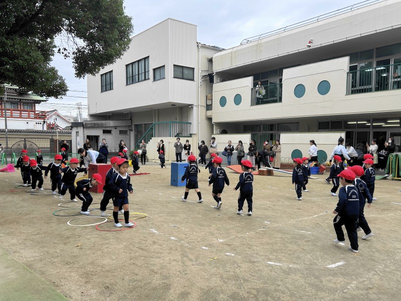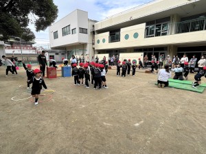 園庭を使った保育参観がありました。普段のサーキット運動風景を見ていただくとともに、リース作りや運動あそびに参加してもらいました。