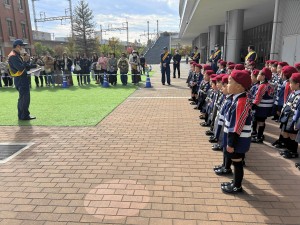11月9日から15日までの7日間を「秋の火災予防運動」の期間として、市内の各消防署が街頭広報など啓発活動を行います。幼年消防クラブ員の年長児も堺消防署と協力して、法被姿で防火の呼びかけと鼓隊演奏を行いました。