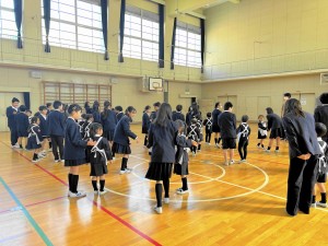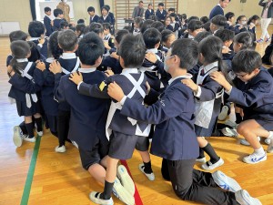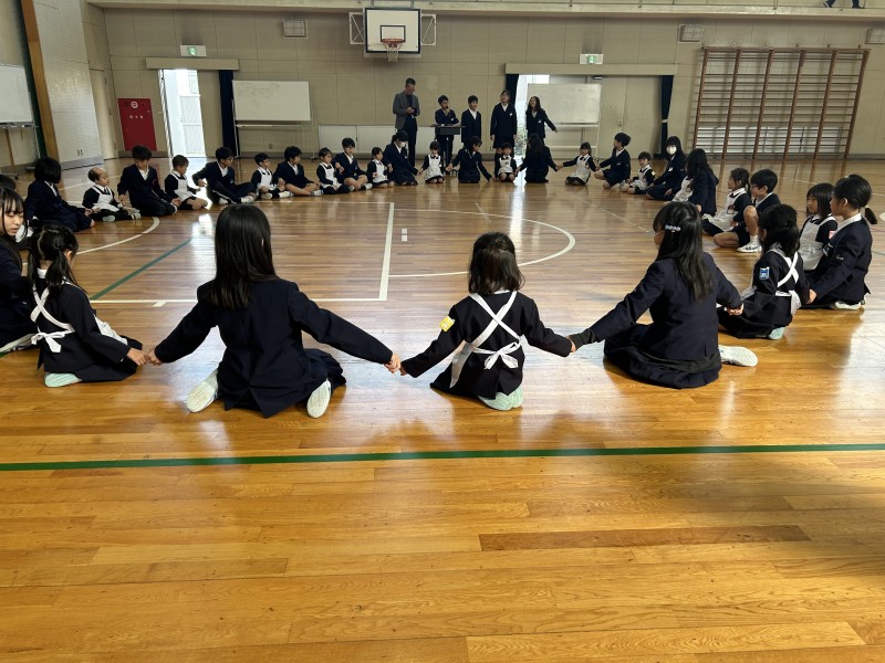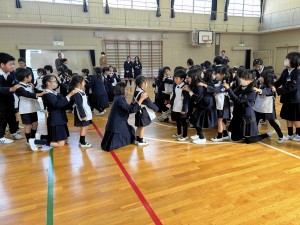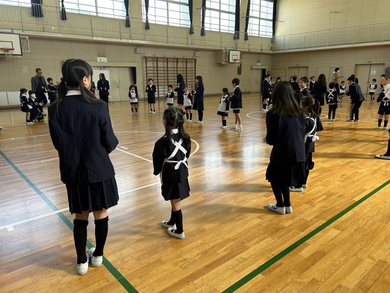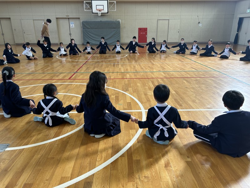 体育館では、リーダーが「キャッチ!」と言った瞬間に、右手の人差し指は引いて、左手の輪っかをギュッと握る「キャッチゲーム」や、歌を歌いながらお友だちとじゃんけんの勝負をして、負けた人は勝った人の後ろについて肩を持ち、列を作っていく「じゃんけん列車」をして遊びました。最後に、小学生のお兄さん・お姉さんが歌をうたってくれて楽しい時間を過ごすことができました。