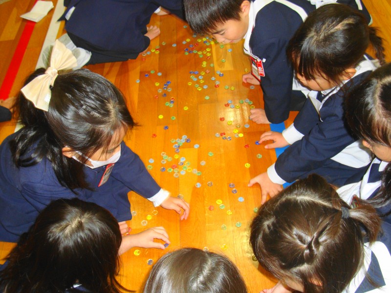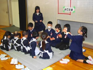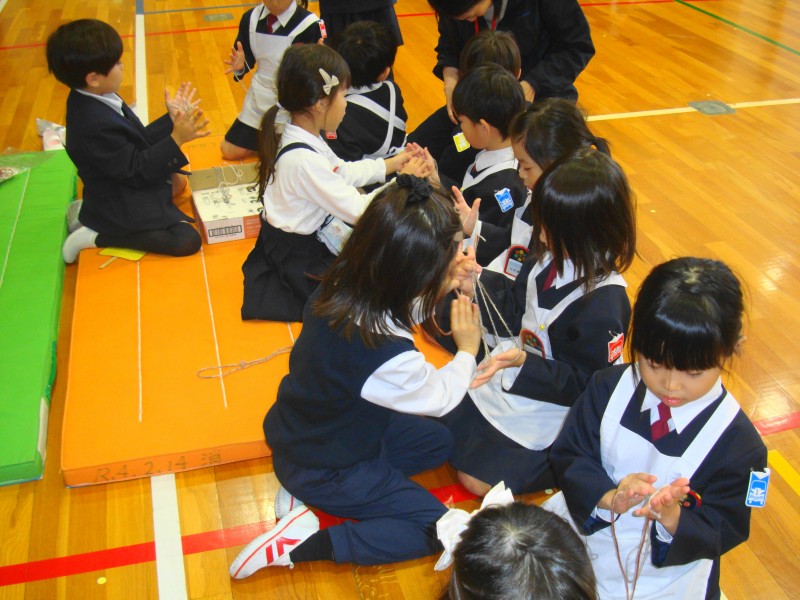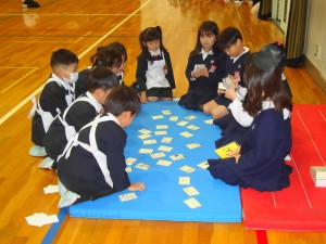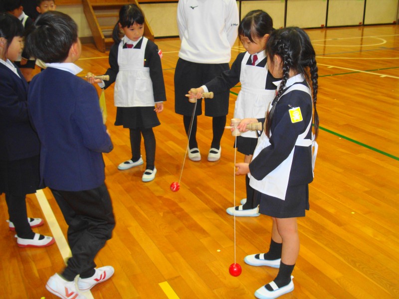 1年生の児童に教えてもらいながら、あやとりやかるた、お手玉、こま回し、けん玉、おはじきなど、日本の伝統的な遊びを体験してきました。