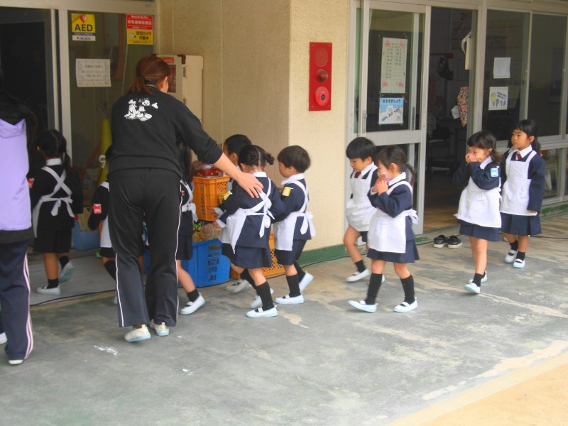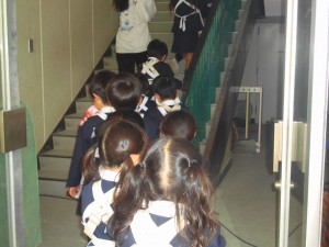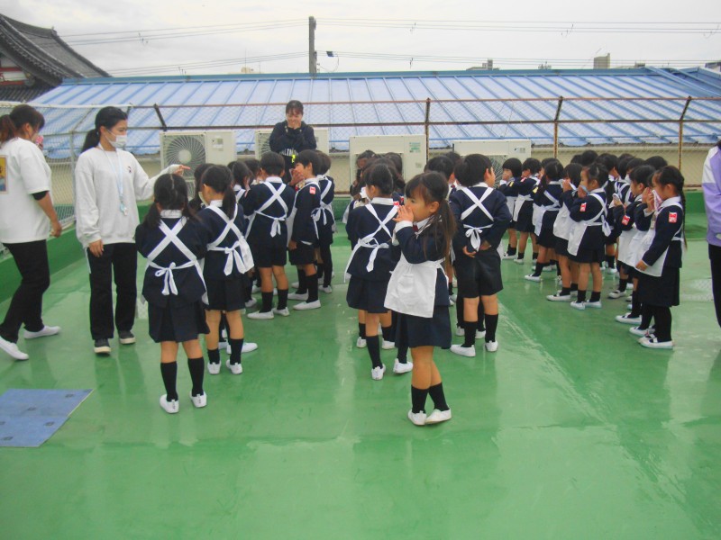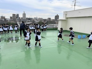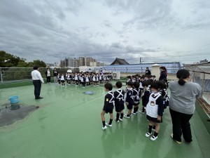 今日は「大阪880万人訓練」がありました。訓練用の「エリアメール/緊急速報メール」が大阪府内の携帯電話に一斉送信され、園内にも館内放送で地震が起きたことを知らせます。地震発生後、大津波警報が発表されたとの想定で、屋上に避難する訓練を実施しました。